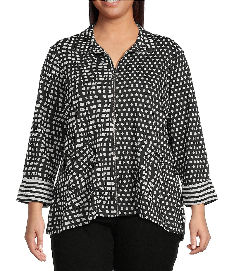 Ali Miles Plus Size Abstract Dotted Mock Neck Elbow Sleeve Zip-Front Tunic