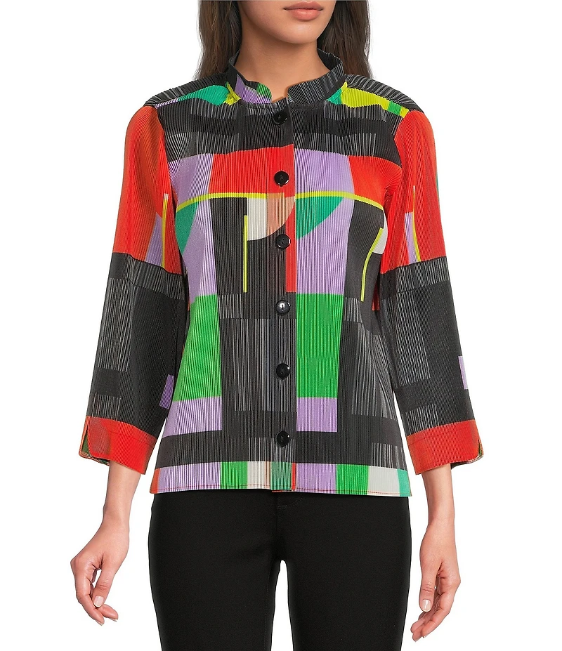 From Ali Miles, this shirt features: Textured crinkle pleated fabrication Wire collar neckline 3/4 cuff sleeves Geo multi print Straight hem Button-front closure Approx. 25" length Polyester Machine wash cold/line dry Imported.
