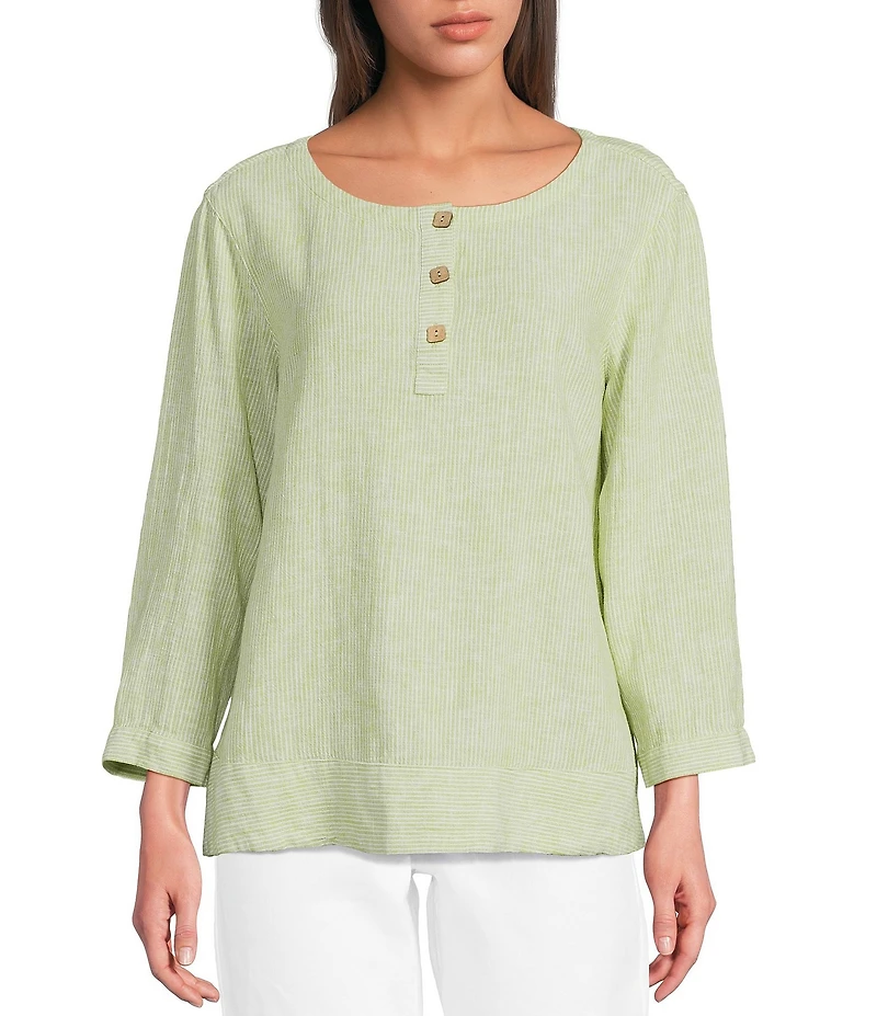 Ali Miles Woven Coordinating Yarn-Dye Stripe Round Neck 3/4 Cuffed Sleeve Button Front Placket Top