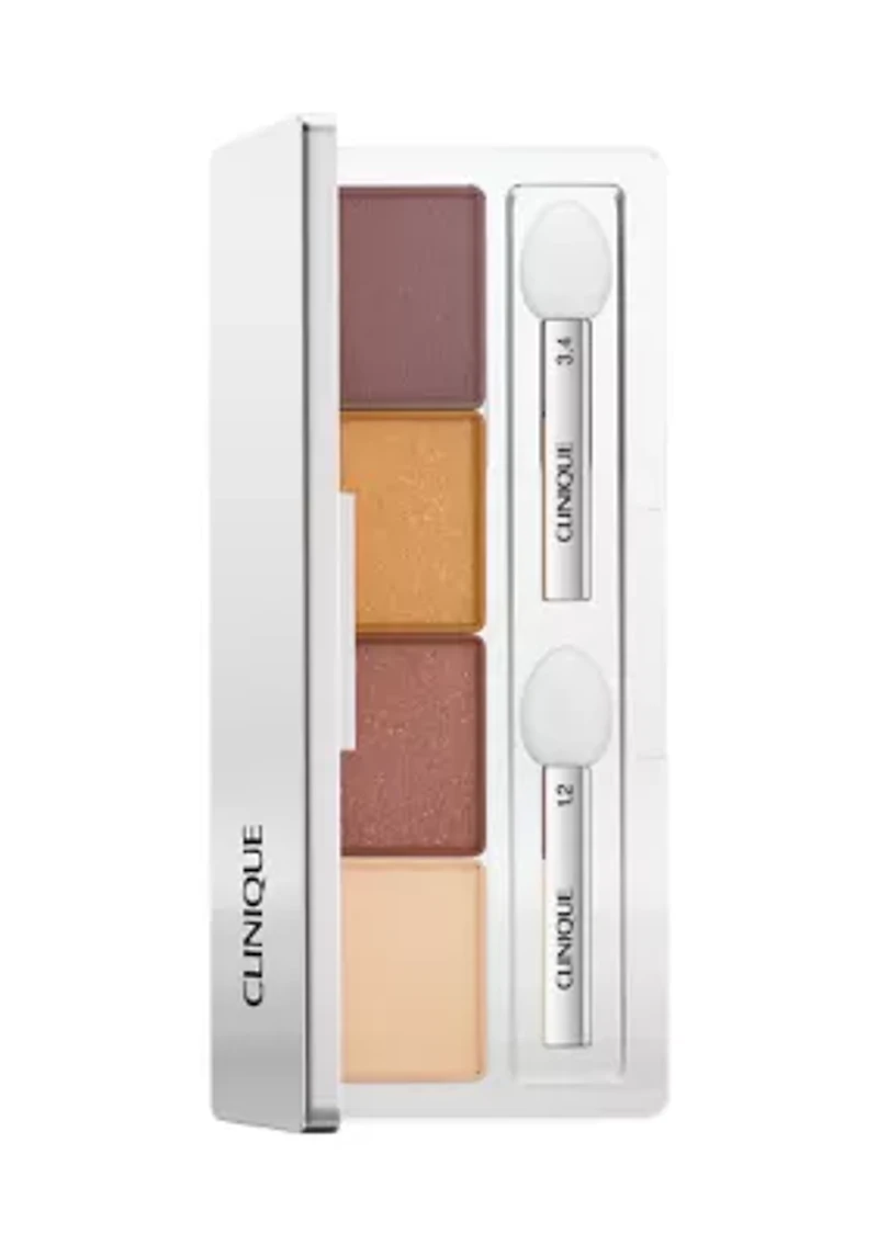 Benefits: Long-wearing, crease and fade resistant. WHAT IT IS Four shades of luscious, long-wearing eye shadow in one convenient compact. Rich, buildable color creates subtle to smoky eye looks. Ophthalmologist tested. Safe for sensitive eyes and contact lens wearers. Allergy tested. 100% fragrance free. PRODUCT DETAILS Formula: • Clinique’s All About Shadow™ powder eye shadow is a long-wearing formula that glides on in one smooth stroke. • Silky texture blends smoothly across lids for seamless application. • Rich, buildable color with 12-hour wear is crease and fade resistant. Shades: • All About Shadow™ eye shadow quads feature four complementary shades in one convenient compact. • Wear shades alone or mix and layer them to define, contour, and highlight. • Create a range of looks, from soft and subtle to smoky and dramatic. Compact: • Mirrored compact includes two sponge-tipped applicators and illustrated how-tos. FORMULA FACTS The Clinique Eye Safety Promise: • Ophthalmologist tested • Safe for sensitive eyes • Safe for contact lens wearers This Product Is Also: • Dermatologist tested • Allergy tested • Fragrance free Great to Know: • 12-hour long-wear • Crease and fade resistant Free Of: • Fragrance • Parabens • Phthalates HOW TO USE • Use applicator to sweep a base shade across entire lid, from lashline to brow bone. • Create dimension with medium-toned eye shadow shades. • Layer and blend color into the crease and/or along lashlines. • Deepest shade can be applied as a liner along lashlines using the applicator tip. • For more detailed application, apply with brushes from Clinique’s makeup brush collection. • Remove with your favorite Clinique makeup remover. Imported