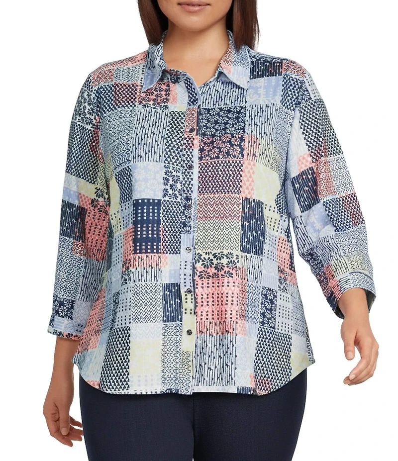 Allison Daley Plus Size Patchwork Print 3/4 Sleeve Point Collar Button Front Shirt