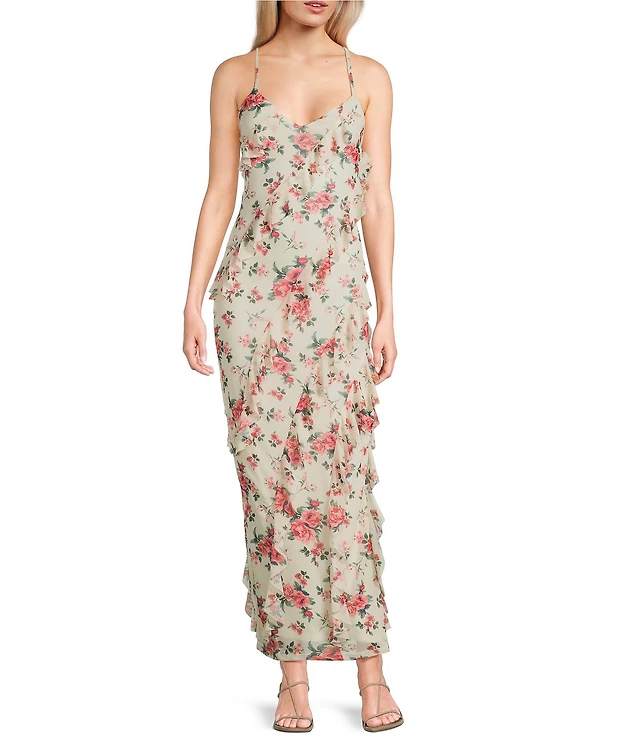 Allison & Kelly Floral Printed Chiffon Jacquard Drape Back Long Dress