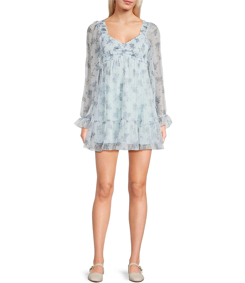 Allison & Kelly Organza Floral Printed Smocked V-Neck Long Sleeve Dress
