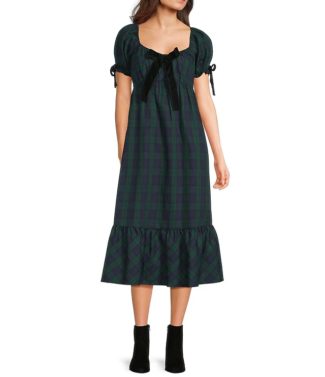 Allison & Kelly Plaid Printed Scoop Neck Bow Front Short Sleeve Midi Dress