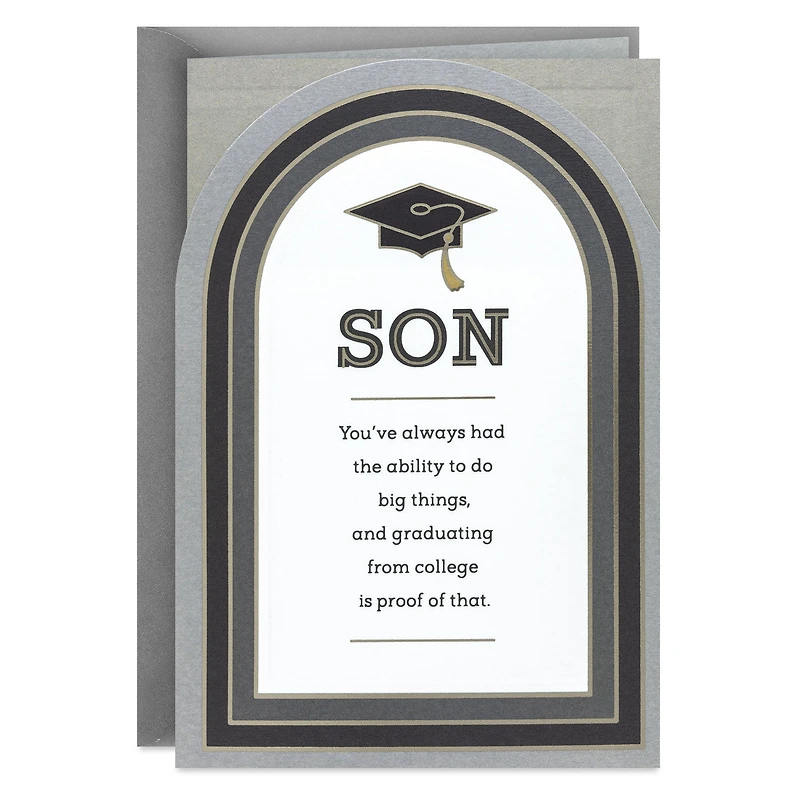Graduation greeting card for son features a stately arch shape, framed in gray and black, with a black mortarboard design above a heartfelt message of support from his mom, dad or parents. Die-cut shape design with embossing and foil accents.