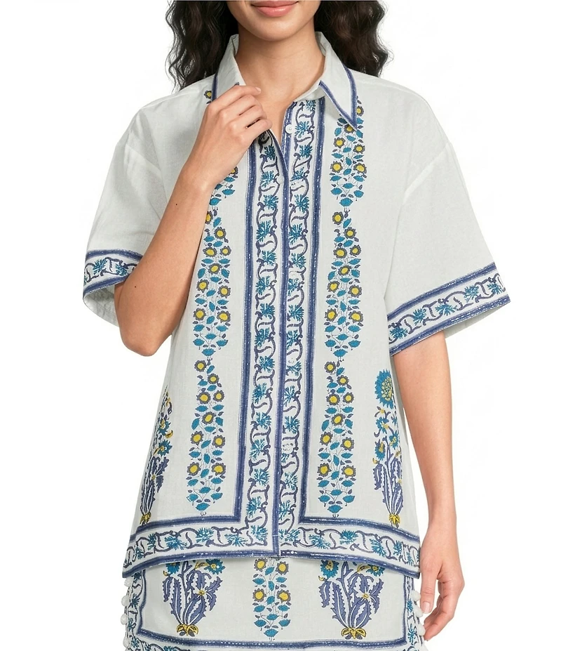 Amalfi Linen Cotton Blend Collared Button Front Hand Painted Blouse in Franklin, TN