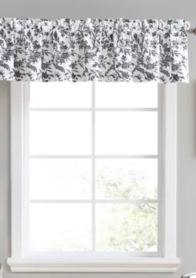 Floral toile designs have timeless appeal and Laura Ashley Amberley is classic in black on a soft white ground. This window valance adds the finishing touch to any room. made of 100% cotton. machine washable for easy care. valance is not lined. Soft 136 Floral China Imported Product Specifications Pole Top Valance: 15"W X 86"L Material & Care Cotton Machine washable