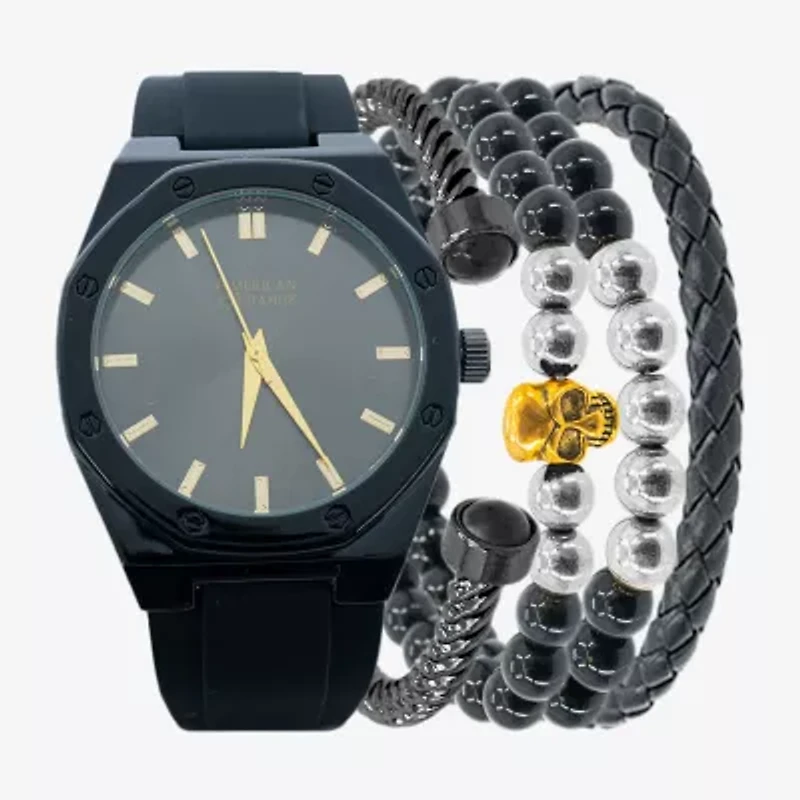The American exchange men's watch and bracelet set is a great way to show your personality and express your individual style. The stackable bracelets gives a contemporary yet classic look.