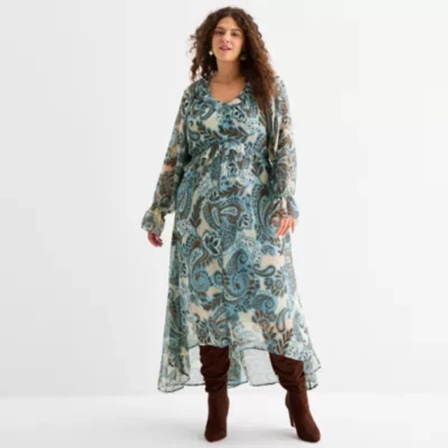 Worthington Womens Plus Long Sleeve Floral Maxi Dress