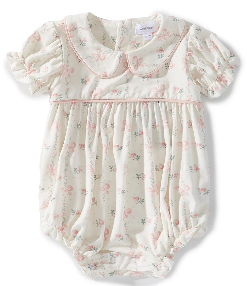 From Angel Dear, this bubble features: Allover Dainty Buds and Bows print Peter pan collar Short sleeves Snap leg closure Viscose from bamboo/spandex Machine wash/tumble dry Imported.