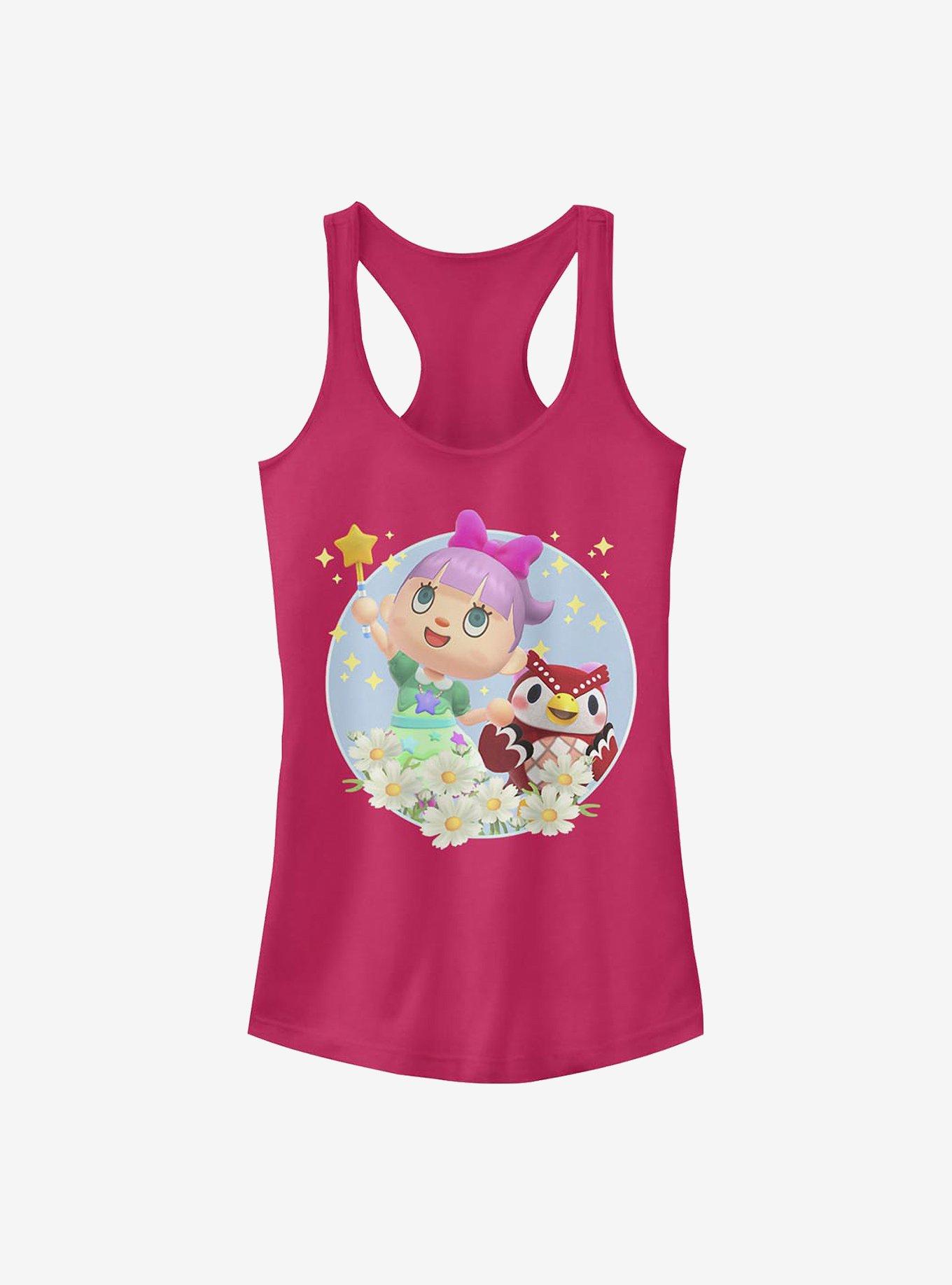 Transform your look with a flick of the wand and this tank top from Animal Crossing ! Celeste and a female villager are printed on the front with the wand, white cosmos and sparkles.