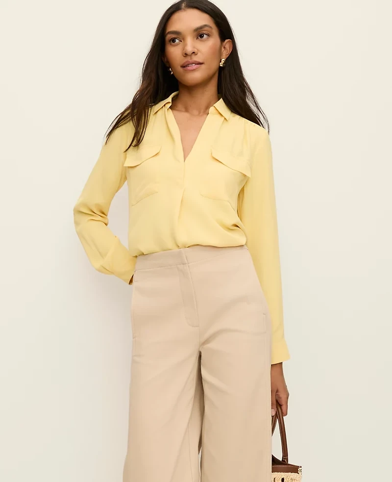 We've updated our signature camp shirt with a covered button front and extra shirring, for a fluid and streamlined silhouette that works anywhere. Point collar Long sleeves with button cuffs. Hidden - button front placket with pleat beneath. Front flap patch pockets. Shirred forward shoulder seams and back yoke. Shirttail hem, Imported:, Fit: Classic an easy, straight fit Length: 28 1/4"long, Fabrication: 100% Polyester, Garment Care: Machine Washable Camp Shirt by Ann Taylor Size Classic - 2XS Fresh Pineapple Women's Split, Neck Long Sleeve Button Down Tops 100% Polyester Machine Washable