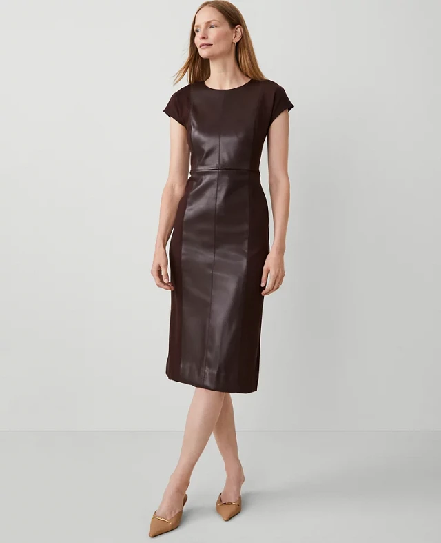 Ann Taylor Petite Faux Leather Mixed Media Dress Pure Chocolate Women's