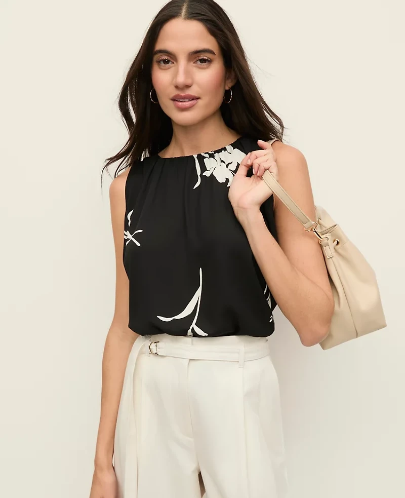 Designed with a woven front and a knit back, this top is at once eye - catching and versatile. Boatneck Sleeveless Back slit with button closure., Imported:, Length: 22 1/4"long, Fabrication: Knit 92% Polyester, 8% Spandex Woven: 100% Polyester, Garment Care: Machine Washable Petite Floral Mixed Media Gathered Top by Ann Taylor Size Petite - 2XS Black Women's 100%, Cotton Boatneck Sleeveless Tanks Shells Tops Knit 92%, Polyester 8% Spandex Woven 100%, Polyester Machine Washable