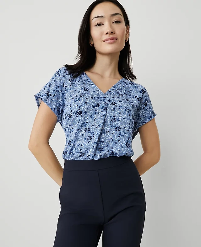 Ann Taylor Petite Floral Mixed Media Pleat Front Top Poised Plum Women's