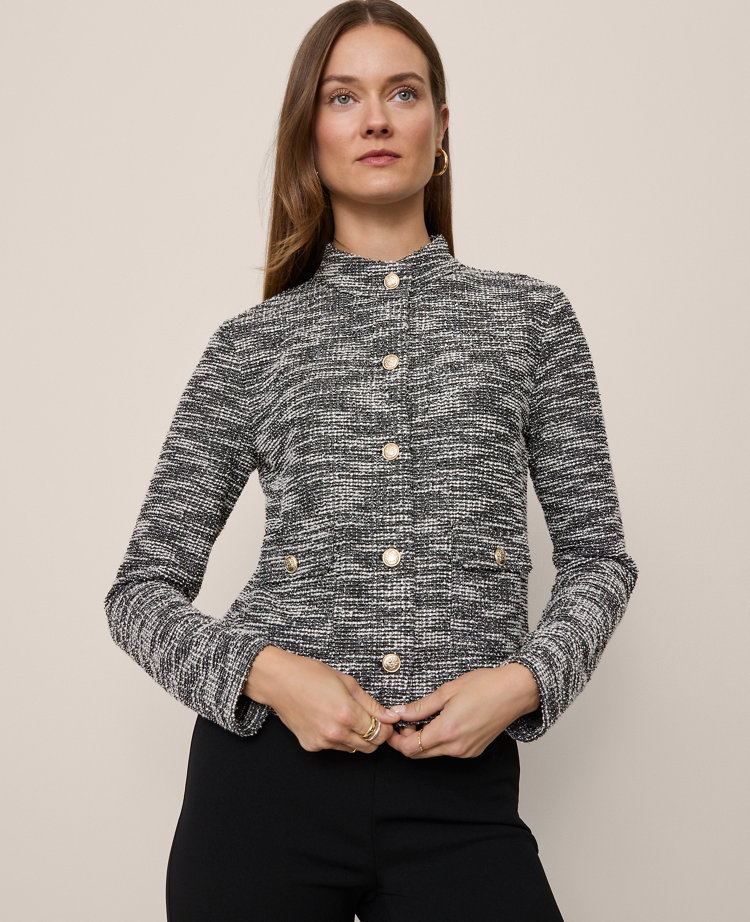 Done in a tailored, jacket - inspired design, this chic cardigan is equally polished and elevated. Split neck Front - button closures. Long sleeves Front flap patch pockets., Imported:, Length: 20 1/4"long, Fabrication: 71% Polyester, 24% Cotton, 1% Spandex, 4% Other Fibers, Garment Care: Machine Washable Petite Mock Neck Cardigan by Ann Taylor Size Petite - Large Black Multi Women's Split, Neck Long Sleeve Cardigan Tops 71% Polyester 24% Cotton 1% Spandex 4% Other Fibers Machine Washable