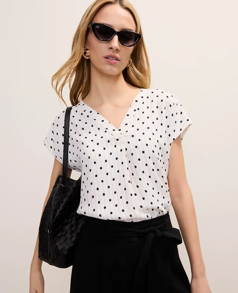 A clever pleated front adds extra fluidity to this mixed knit - and woven essential. V - neck with pleat beneath. Short sleeves Woven front and sleeves. Knit back, Bullet1: For heights 5'4"and below, try our petite fit., Imported:, Length: 24 1/2"long, Fabrication: knit 92% polyester 8 spandex woven: 100% polyester, Garment Care: Machine Washable Petite Polka Dot Mixed Media Top by Ann Taylor Size Petite - 2XS Pale Sandalwood Women's V - Neck, Short Sleeve Blouse Tops knit 92%, polyester 8% spandex woven 100%, polyester Machine Washable