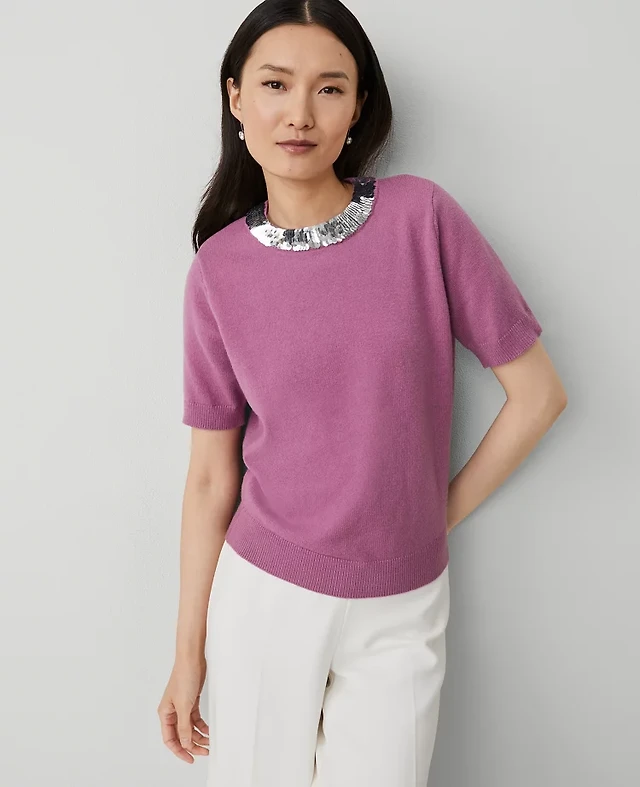 Ann Taylor Sequin Neck Short Sleeve Sweater Size XS Autumn Rose Women's