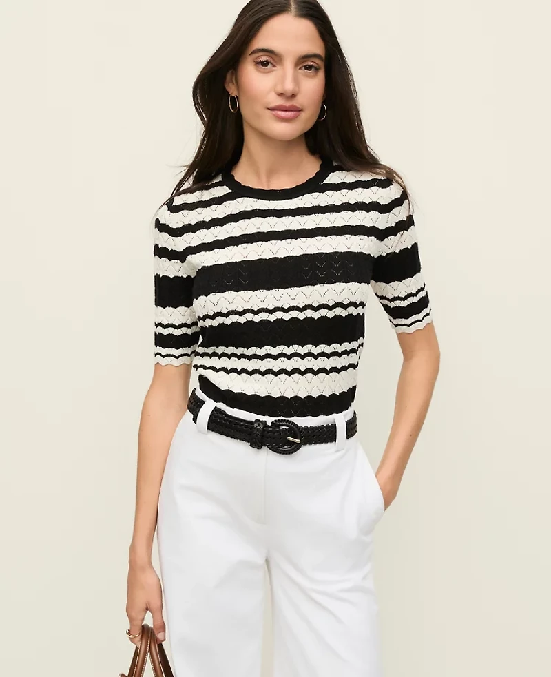 Lovely scalloped trims enhance the feminine pointelle pattern of this easy - wearing sweater tee. Crew neck Short sleeves, Imported:, Fit: Softly fitted, Length: 22 1/4"long, Fabrication: 88% Cotton, 12% Nylon, Garment Care: Machine Washable Striped Pointelle Sweater Tee by Ann Taylor Size Classic - 2XS Black Women's Cotton, Blend Crew Neck Short Sleeve Pullover Sweaters 88% Cotton 12% Nylon Machine Washable