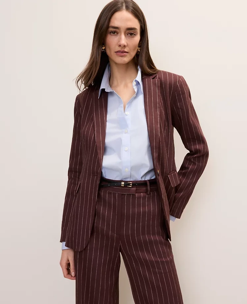 Ann Taylor The Long One Button Blazer Linen Blend Pinstripe Rich Walnut Women'sAnn Taylor The Long One Button Blazer Linen Blend Pinstripe Rich Walnut Women's