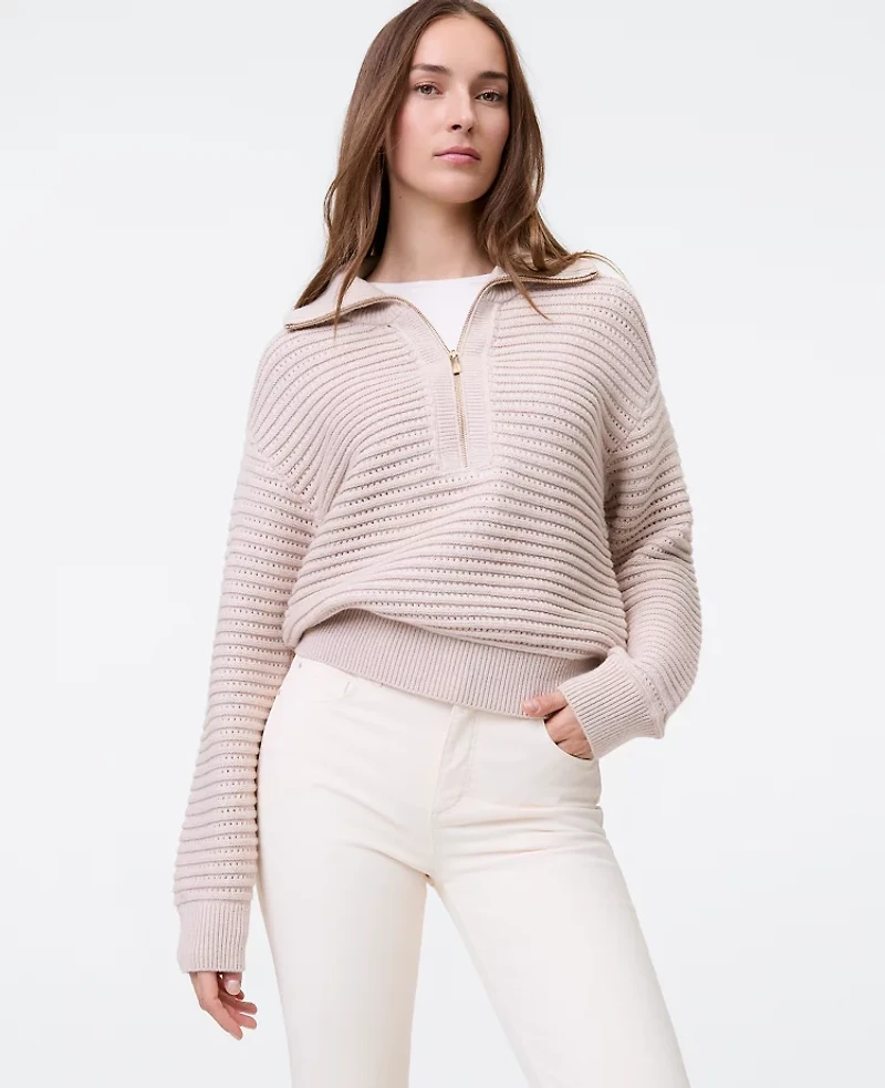 Discover Ann Taylor Weekend. Effortlessly polished pieces for wherever your plans take you. Instantly elevate laid - back looks with this cozy must - have half zip sweater. Ribbed V - neck, cuffs and hem. Half - zip closure. Long sleeves, Imported:, Fit: Relaxed fit, Length: 21"long, Fabrication: 53% Cotton, 27% Polyester, 20% Nylon, Garment Care: Machine Washable Weekend Collection Textured Stitch Half - Zip Sweater by Ann Taylor Size Classic - 2XS Muted Taupe Heather Women's Cotton, Blend V - Neck, Long Sleeve Pullover Sweaters 53% Cotton 27% Polyester 20% Nylon Machine Washable Best Fall Sweaters