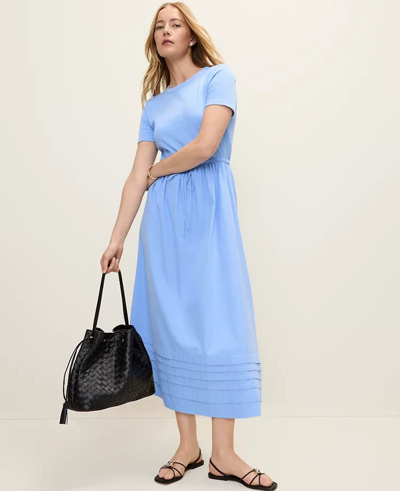 Discover Ann Taylor Weekend. Topped with a comfortable drawstring waist, this midi dress is equally effortless and put - together. Crew neck Short sleeves Elasticized drawstring waist. Lined skirt, Bullet1: For heights 5'4"and below, try our petite fit., Hit: Hits at mid - calf, Imported:, Length: 32"from natural waist, Fabrication: Bodice 89% Cotton, 11% Spandex; Skirt: 100% Cotton; Skirt Lining: 100% Cotton, Garment Care: Machine Washable Weekend Mixed Media Crew Neck Midi Dress by Ann Taylor Size Classic - 2XS Vista Blue Women's Fit, Flare Cotton Blend Regular Crew Neck Short Sleeve Dresses Bodice 89%, Cotton 11% Spandex Skirt 100%, Cotton Skirt Lining 100%, Cotton Machine Washable
