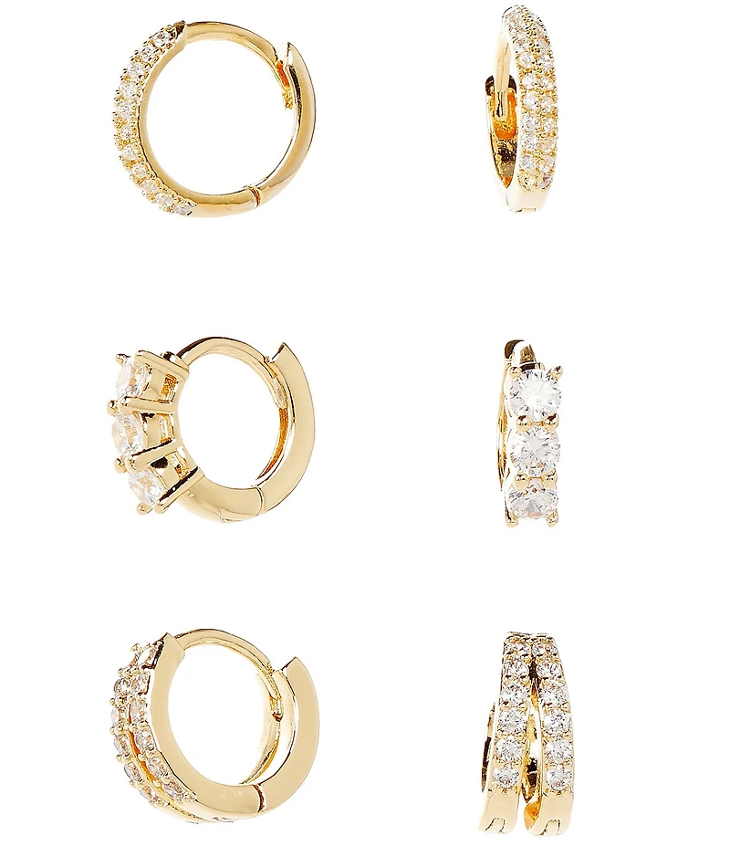 From Anna & Ava, these earring set feature: Hoop earring set Waterproof 18K gold plated brass with cubic zirconia stones Click top closure Set of 3 Studs measure approx. 0.5" dia. Imported.