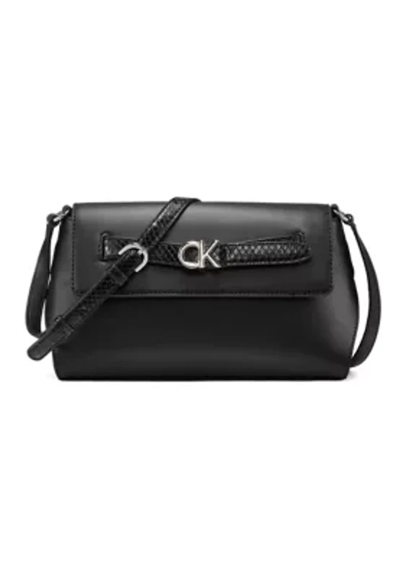 This Calvin Klein crossbody features a sleek design with a convenient snap-tab closure for secure, easy access. 23" crossbody strap Imported Product Specifications 10" x 5.5" x 3.5" Material & Care Faux leather, PVC trim Clean with a damp cloth or soft brush