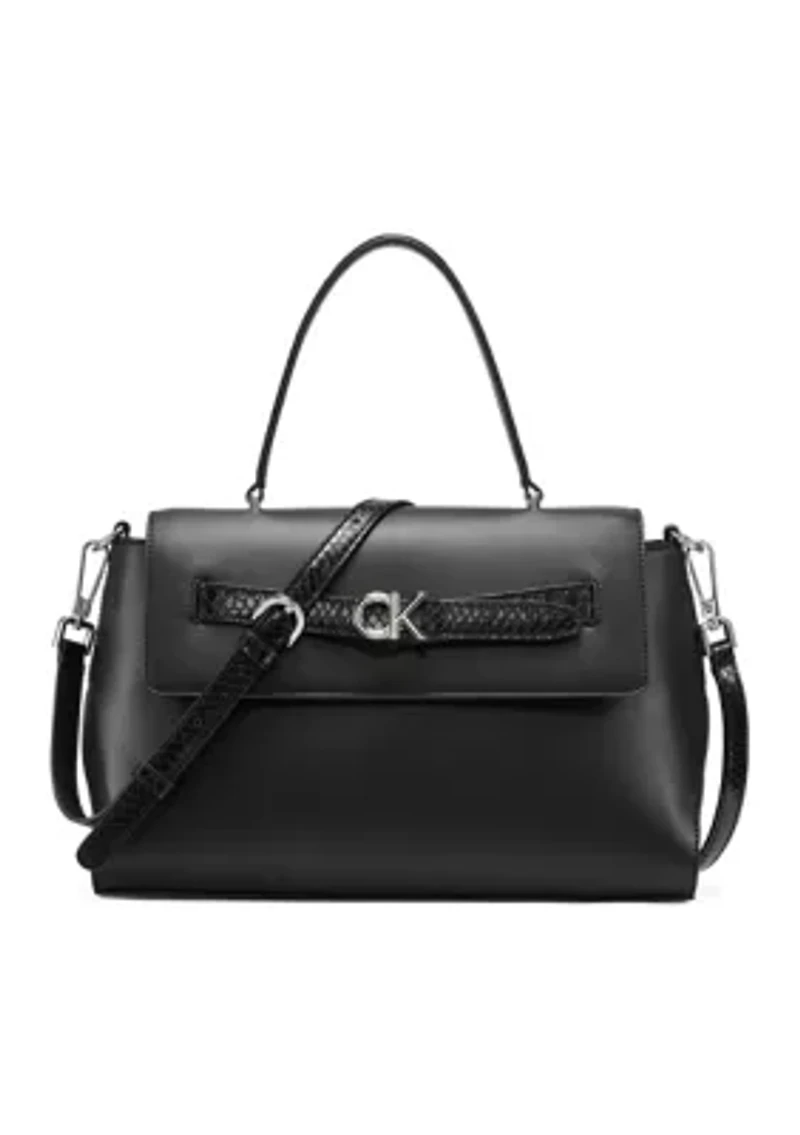 The Annalise satchel from Calvin Klein features a structured design with a top handle and detachable strap for versatile, hands-free styling. 5" top handle, 23" strap Imported Product Specifications 11.5" x 7.5" x 4.5" Material & Care Faux leather, PVC trim Clean with a damp cloth or soft brush