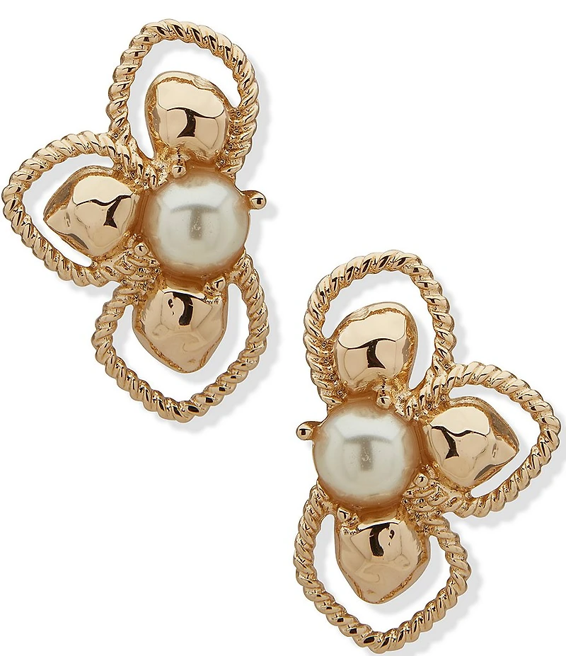 Anne Klein Gold Tone Openwork Hammered Pearl Floral Button Clip Stud Earrings