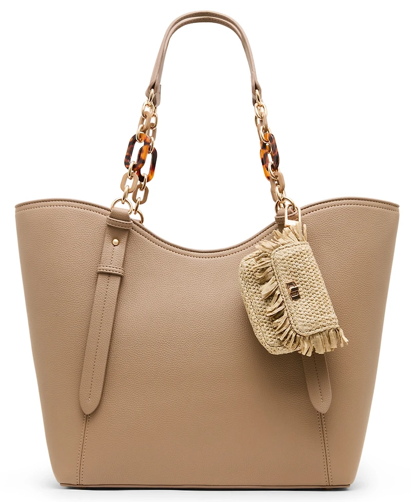 Elevate your style with this medium tote bag! Features a fun straw mini handbag charm and tortoise chain strap. Perfect for work or travel and spacious enough to fit all your essentials.