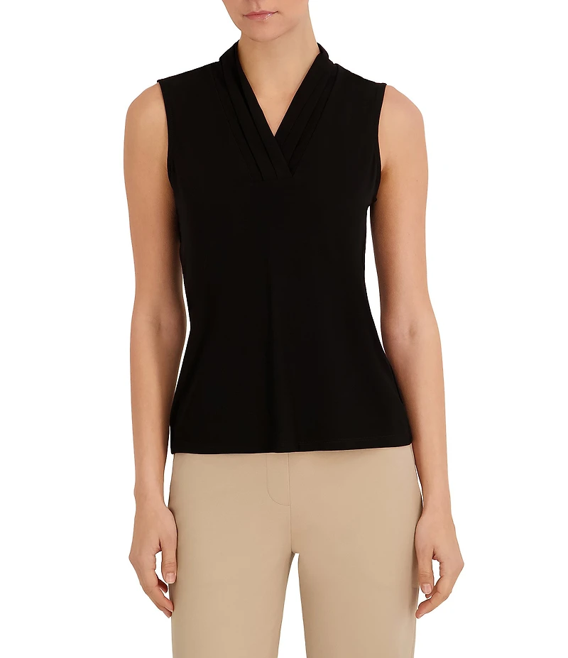 From Anne Klein Petite, this top features:  Jersey knit fabrication  Blouse silhouette  V neckline  Sleeveless  Pull on construction  Approx. 23" length  Polyester  Dry clean  Imported.