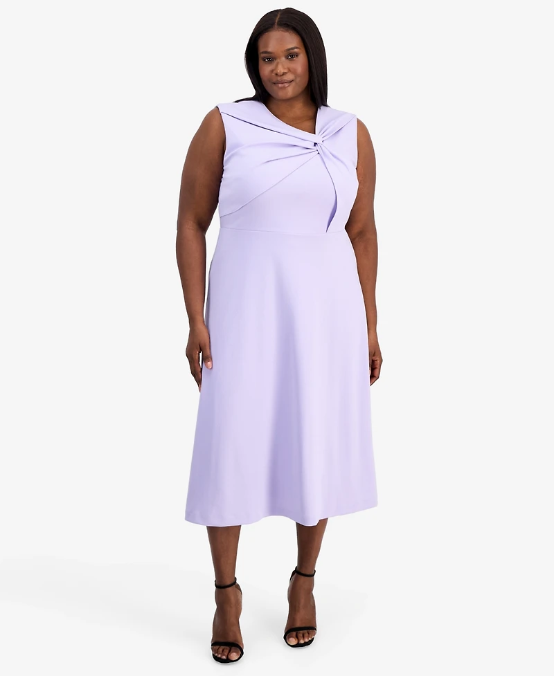 Sophisticated texture, flattering form. This plus size midi dress by Anne Klein features a chic twist-front detail that beautifully defines the silhouette. Crafted from premium pebble crepe, it offers a refined finish for any occasion.