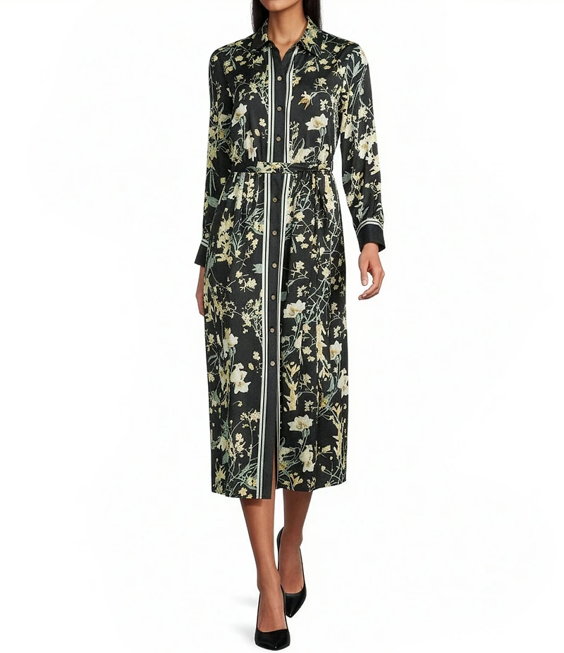 From Anne Klein, this dress features: Printed satin twill fabrication Shirt dress silhouette Point collar neckline Long sleeves Floral print Belted Buttons at center front Approx. 49" length Polyester Dry clean Imported.