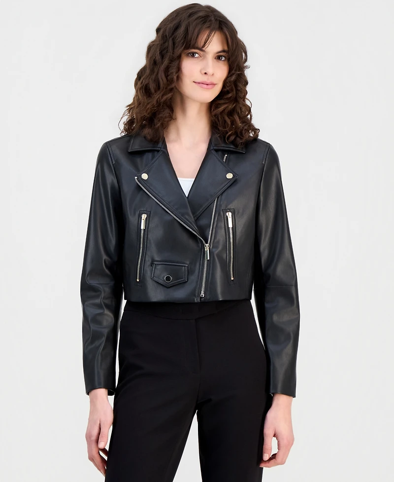 A cool finishing touch to get you from A to B, this moto jacket from Anne Klein has a contemporary cropped fit and faux-leather finish.