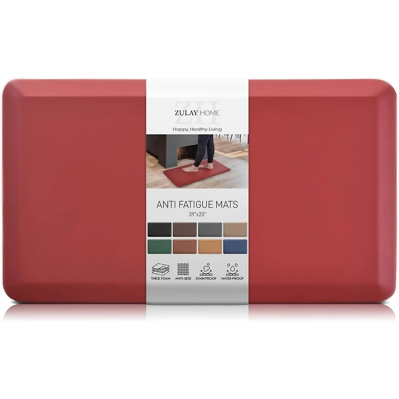 Reduce fatigue and stay comfortable while you work with the Zulay Home Large Anti Fatigue Floor Mat. Measuring 20 x 39 inches with a 3/4 inch thick cushioned design, this mat provides excellent support for your feet, knees, and lower back during long periods of standing. The high-density memory foam core helps reduce pressure and improve comfort whether you're cooking in the kitchen, working at a standing desk, doing laundry, or working in the garage. The non-slip bottom keeps the mat securely in place on various floor surfaces, while the durable, water-resistant surface is easy to clean with a simple wipe. Designed for everyday use, this anti-fatigue mat maintains its shape over time and provides reliable support where you need it most. Perfect for home or office use, this large cushioned floor mat combines comfort, durability, and practicality to make standing tasks easier and more comfortable every day.