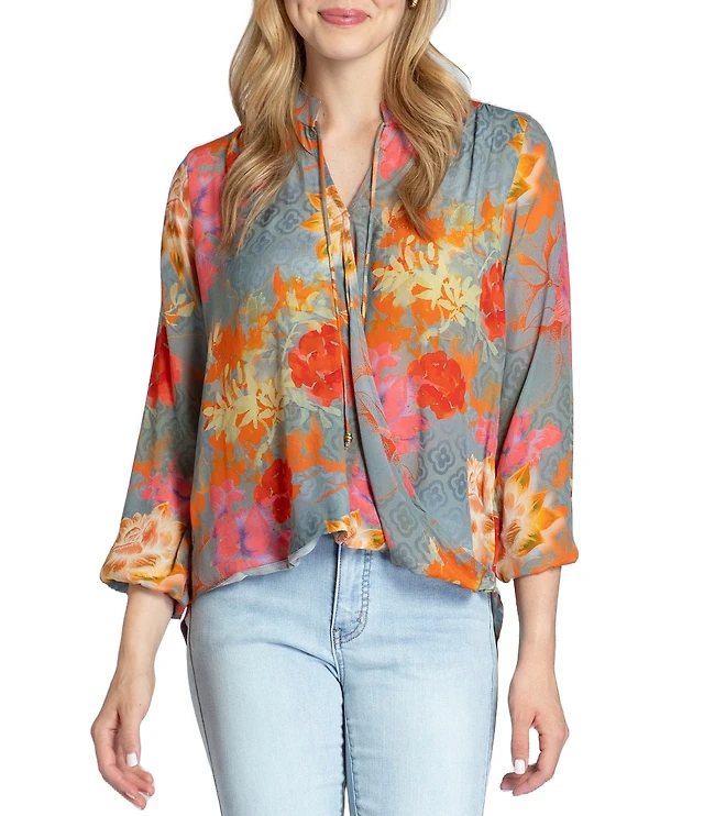Karen Kane Stretch Knit Floral Draped Crossover V-Neck Long Sleeve Top