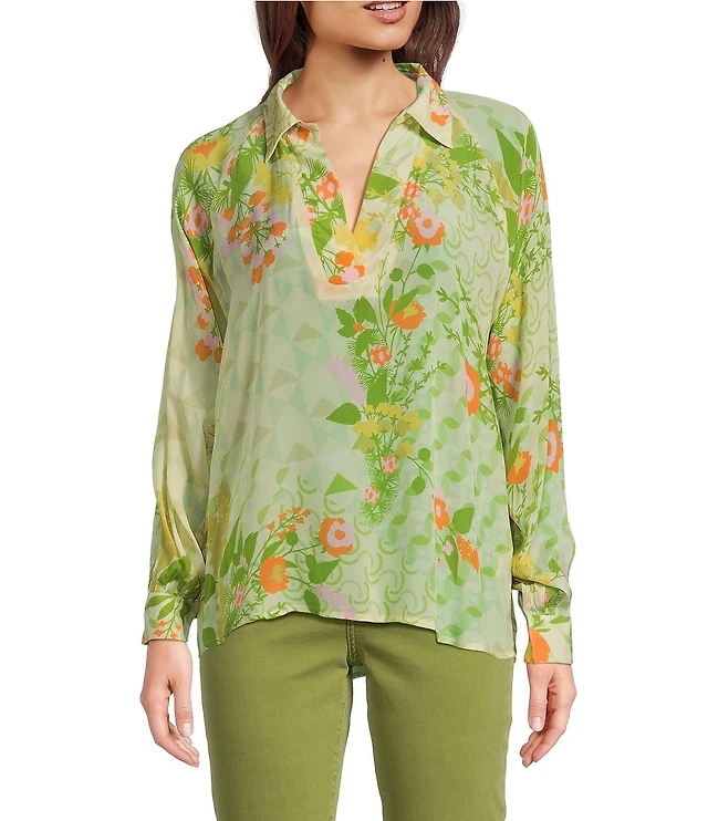 APNY Woven Floral Printed Spread Collar Long Sleeve Half Placket Blouse