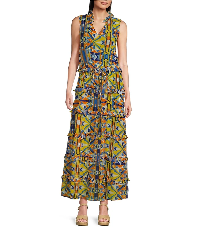 APNY Woven Printed V-Neck Sleeveless Tiered Maxi A-Line Maxi Dress