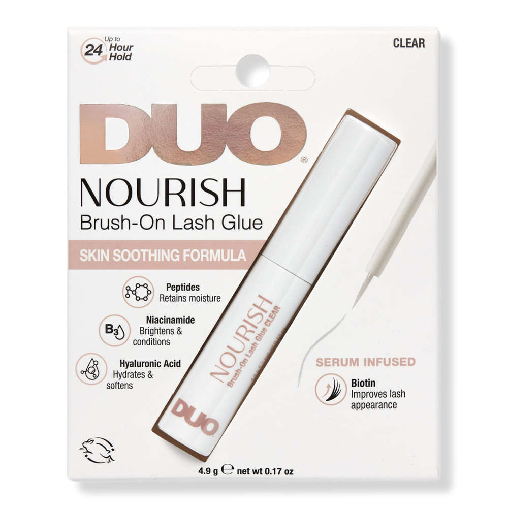 DUO NOURISH BRUSH-ON LASH GLUE CLEAR. Features: Protectively nourishes natural lashes while securely holding falsies. Serum-infused, skin-soothing formula. With Peptides to retain moisture. Niacinamide to brighten, soothe & condition. Hyaluronic acid to hydrate & soften. Biotin to improve lash appearance. Suitable for sensitive eyes & delicate skin. Up to 24-hour strong hold. Benefits: Doubles as a serum without the extra step. Flexible grip keeps lashes in place without stiffness, flaking or irritation. Featherlight feel ensures comfortable all-day wear. No stress, no mess, no guesswork with precision brush tip for foolproof application. Pair with Nourish Lashes to leave lashes feathery, full & fortified. Suitable for sensitive eyes & delicate skin. :