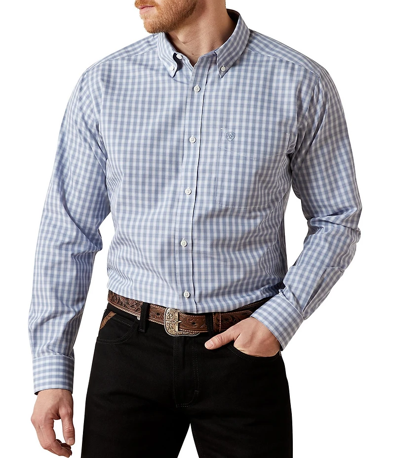 From Ariat, this shirt features: Button-down collar Long sleeves Adjustable cuffs with extended detail make rolling up your sleeves quick and easy Button-front closure Single patch pocket with hidden pen slot Signature "Ariat" branding details Taped seams helps fabrics stay smooth through daily wear, travel, and packing reducing the need for ironing Wrinkle free finish Slim fit Woven cotton Machine wash/tumble dry Imported.