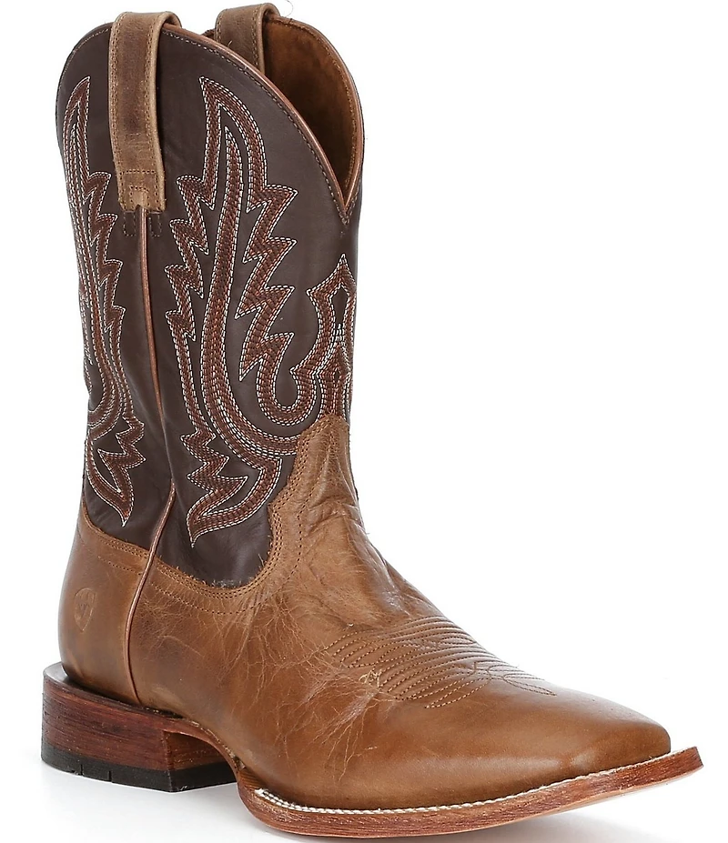 From Ariat, the Men's County Roads Leather Wide Square Toe Cowboy Boots feature: Full-grain leather upper Wide square toe Eight-row stitch pattern Synthetic lining Removable comfort inside Double stitch welt Hand-nailed, scoured and distressed veg-tan leather outsole Approx. 11" shaft height Approx. 1.5" horseman heel Imported.
