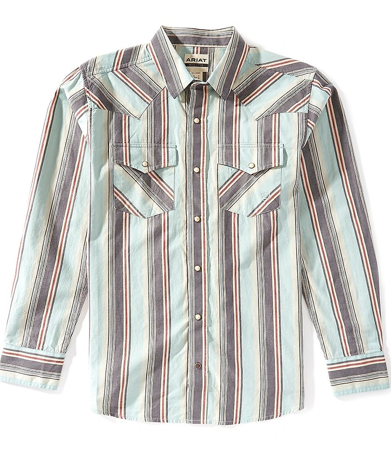 From Ariat, this shirt features: Striped pattern Collared neckline Long sleeves Snap-front closure 2 snap-flap western pockets Western yoke Woven cotton Machine wash/tumble dry Imported.