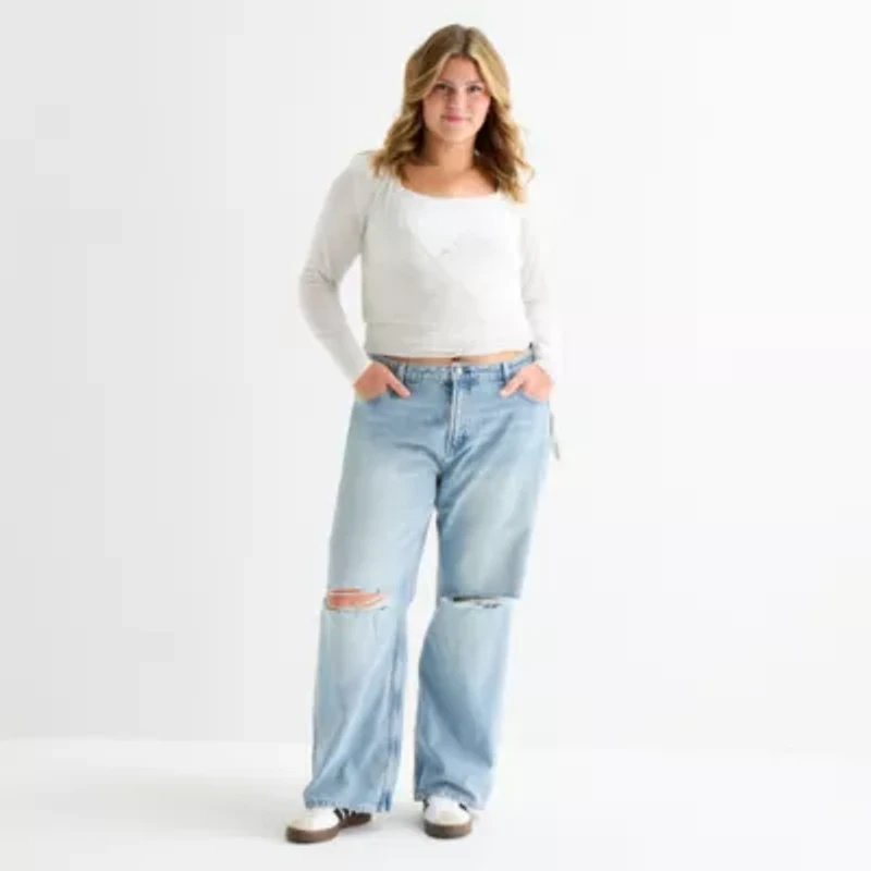 Arizona Bow Back Pocket Womens Juniors Plus Low Rise Ripped Straight Leg Jean