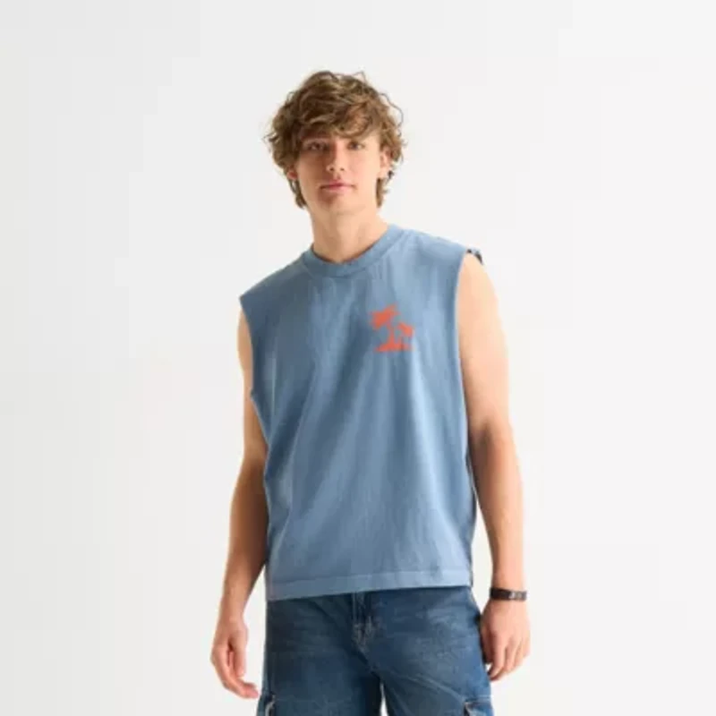 Show off all the work you've been putting in the gym for arm day when wearing this men's sleeveless muscle t-shirt from Arizona Jean Co. Made from soft cotton-jersey, it features a graphic design on the front and back and a classic crew neckline. Wear it with everything from denim shorts to cargo pants.