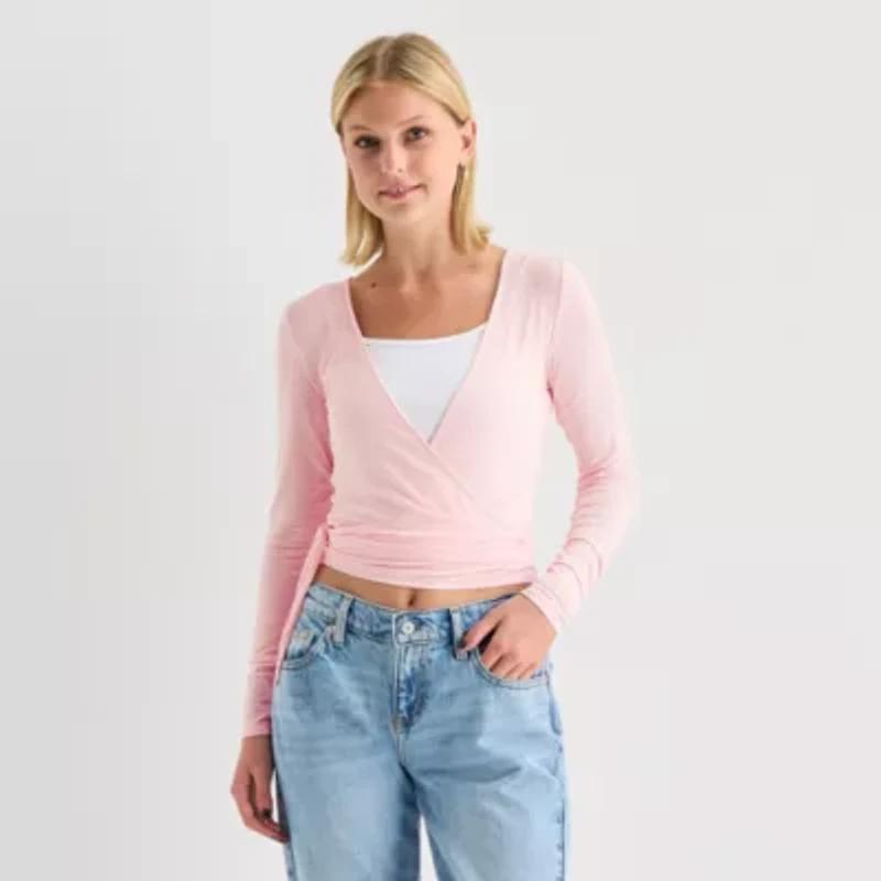 Create an easy look with a comfortable feel when wearing this junior's and women's wrap shirt from Arizona Jeans Co. Made from stretch-jersey, this top has a V-neckline, long sleeves, and adjustable side ties for the perfect fit. Pair it with jeans or skirts.