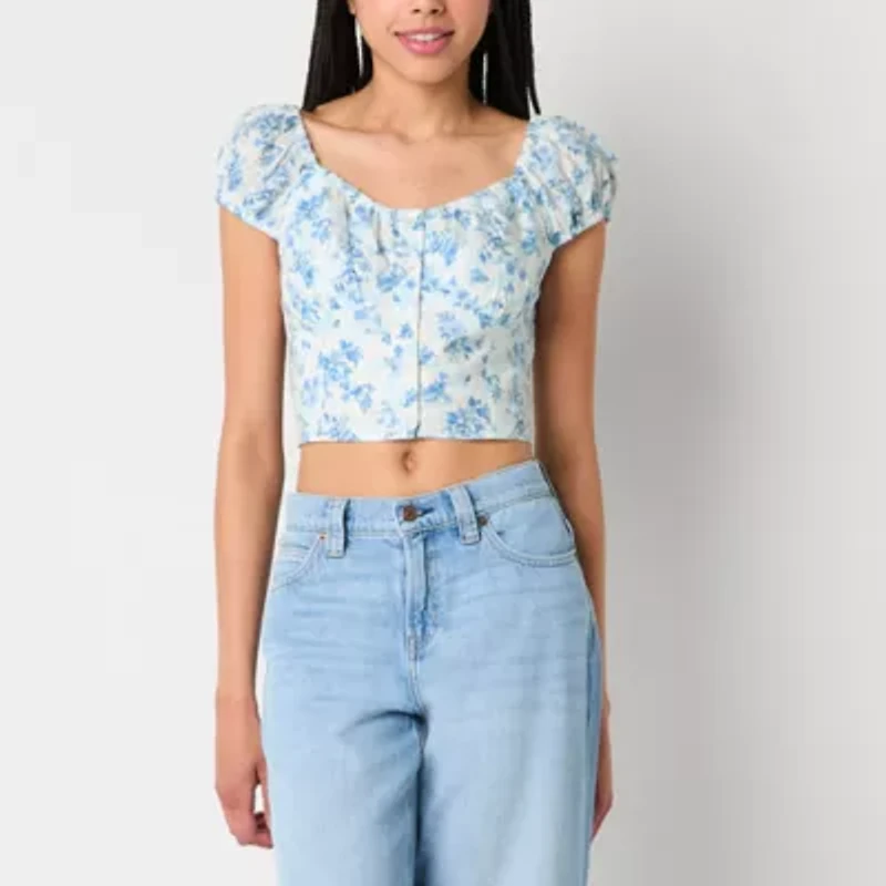 This Arizona Jean Co. cropped blouse for women and juniors is the perfect statement piece for a casual-chic outfit. Crafted from a cotton-blend for a fitted fit, it has a sweetheart neckline, short puff sleeves, smocked detailing, and a button-front closure. Wear yours with high-waisted jeans and sandals.