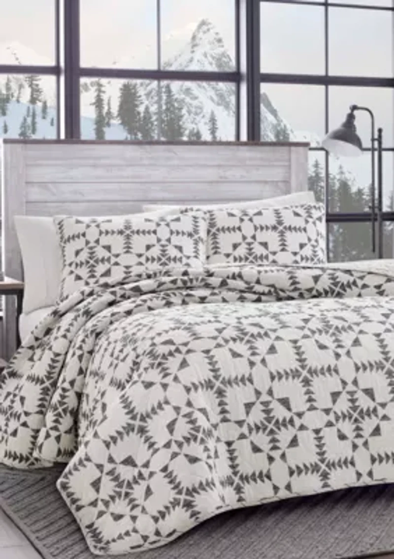Add style and tranquility to your bedroom with the Eddie Bauer Arrowhead Quilt Set by Eddie Bauer. Diamond grid quilt stitching and additional geometric shapes create subtle textural interest and soften the impact of this bold graphic pattern. The quilt reverses to a simple linear design tying the geometric theme together. Twin Set Includes: 1 Quilt: 88 in x 68 in 1 Sham: 21 in x 27 in Full/queen Set Includes: 1 Quilt: 90 in x 90 in 2 Shams: 21 in x 27 in King Set Includes: 1 Quilt: 96 in x 104 in 2 Shams: 21 in x 37 in Reversible Imported Material & Care Cotton Machine washable