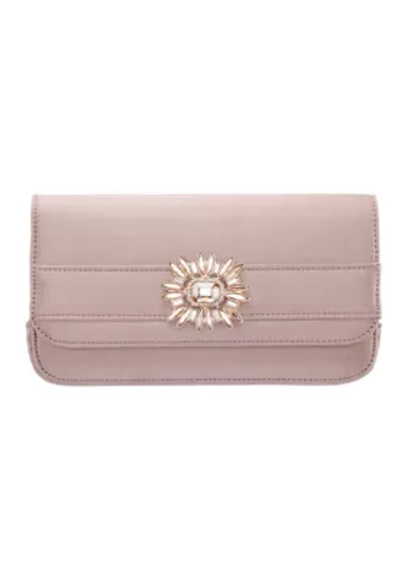 Add a touch of elegance to any look with this Kim Rogers® pouch bag. Its unique art deco design offers a chic vibe that effortlessly elevates any outfit. Push-lock closure 18" drop length shoulder chain Removable strap Interior: 1 inside slip pocket Imported Product Specifications 9" L x 4.75" H x 2" D Material & Care Polyester Spot clean only
