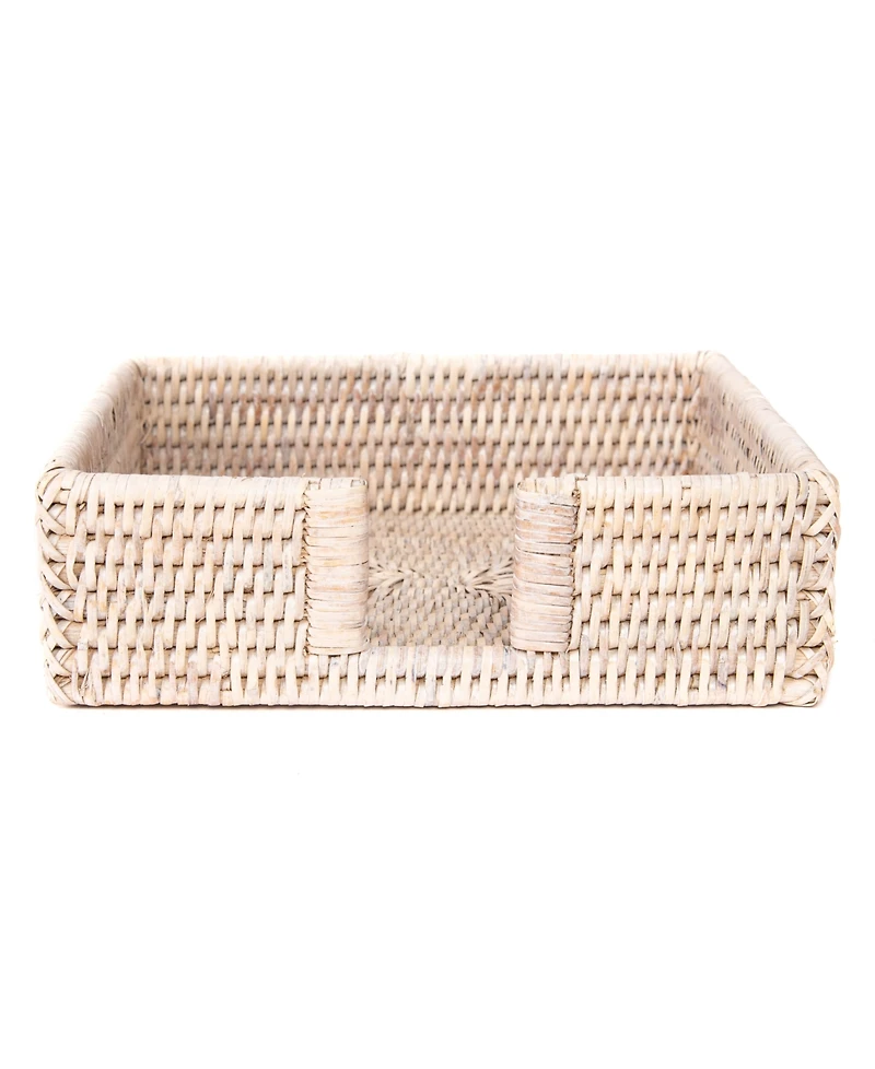 Complete your table setting with this elegant hand woven napkin holder. Whether ita€s a casual or formal setup, our durable and tight rattan weave stained in honey brown, white wash or tudor black will complement your napkins or guest towels. Designed for luncheon napkins, cocktail napkins or guest towels our rattan napkin holder provides a stylish storage space for your kitchen table, office desk, buffet, bar, and bathroom counter top. Products are handmade and each piece is unique therefore slight variations and imperfections exist.